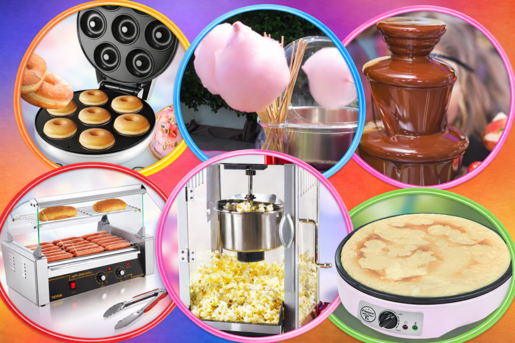 La fuente de chocolate se convierte en el centro de atención, ideal para frutas, dulces y marshmallows. La máquina de algodón de azúcar despierta nostalgia y magia entre los más pequeños. La máquina de donuts ofrece bocados recién hechos, mientras que la máquina de crepes permite disfrutar de combinaciones dulces y personalizadas. Y para completar la experiencia, la máquina de perritos calientes añade un toque clásico que encanta a todos.