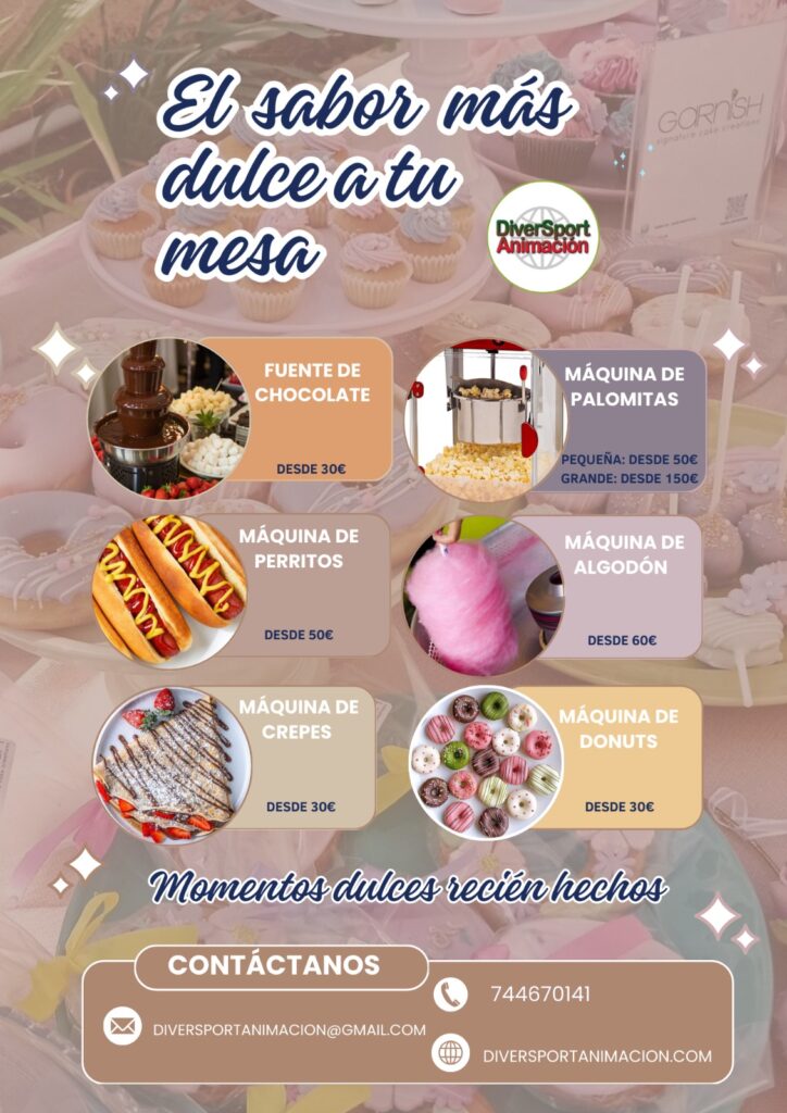 En la búsqueda constante por crear celebraciones únicas y memorables, las máquinas dulces y saladas para eventos se han convertido en una de las opciones más atractivas para sorprender a invitados de todas las edades. En DiverSport Animación, especialistas en animación y eventos en Granada, ponemos a tu disposición una completa oferta de máquinas que combinan sabor, diversión e interacción, convirtiendo cualquier celebración en una experiencia irresistible.